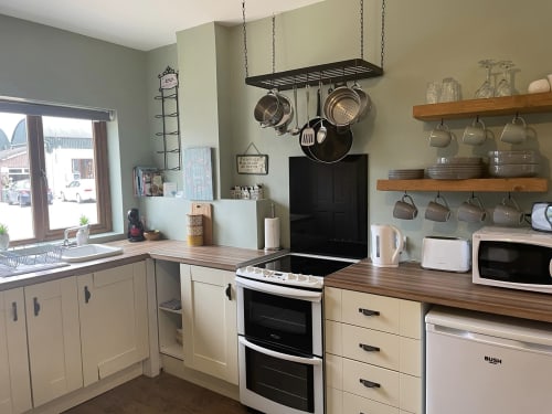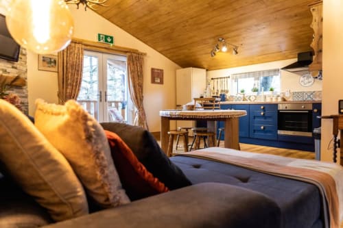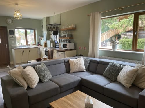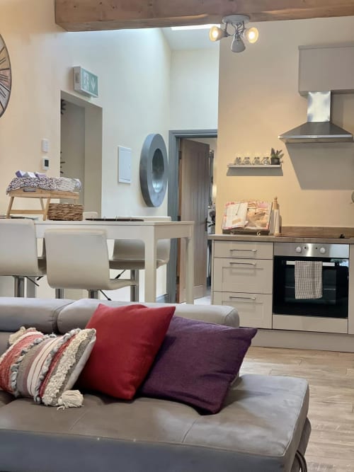 Modern cottage style open plan living downstairs with an additional double sofa bed .